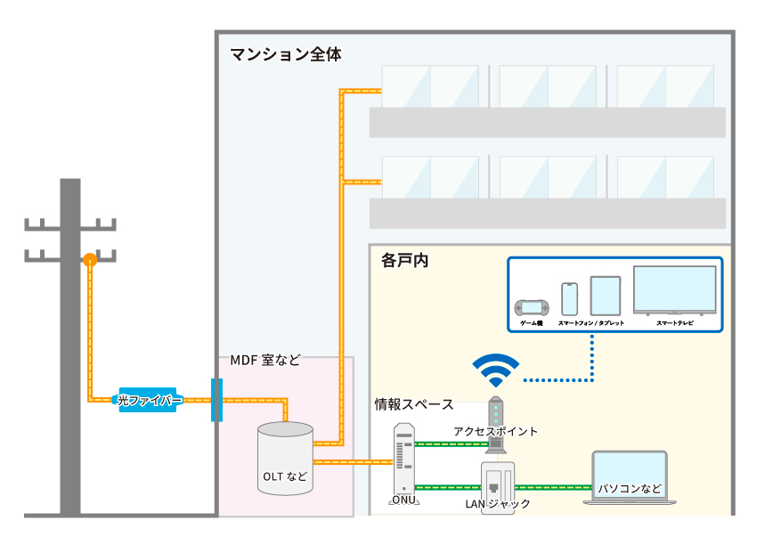 工事とは、建物独自の光ケーブル設備の工事のことで、原則、各住戸まで配線される設備です。建物資産の光設備とも言い換えられ、設備そのものは光インターネットを提供する事業者共通の仕様となります。